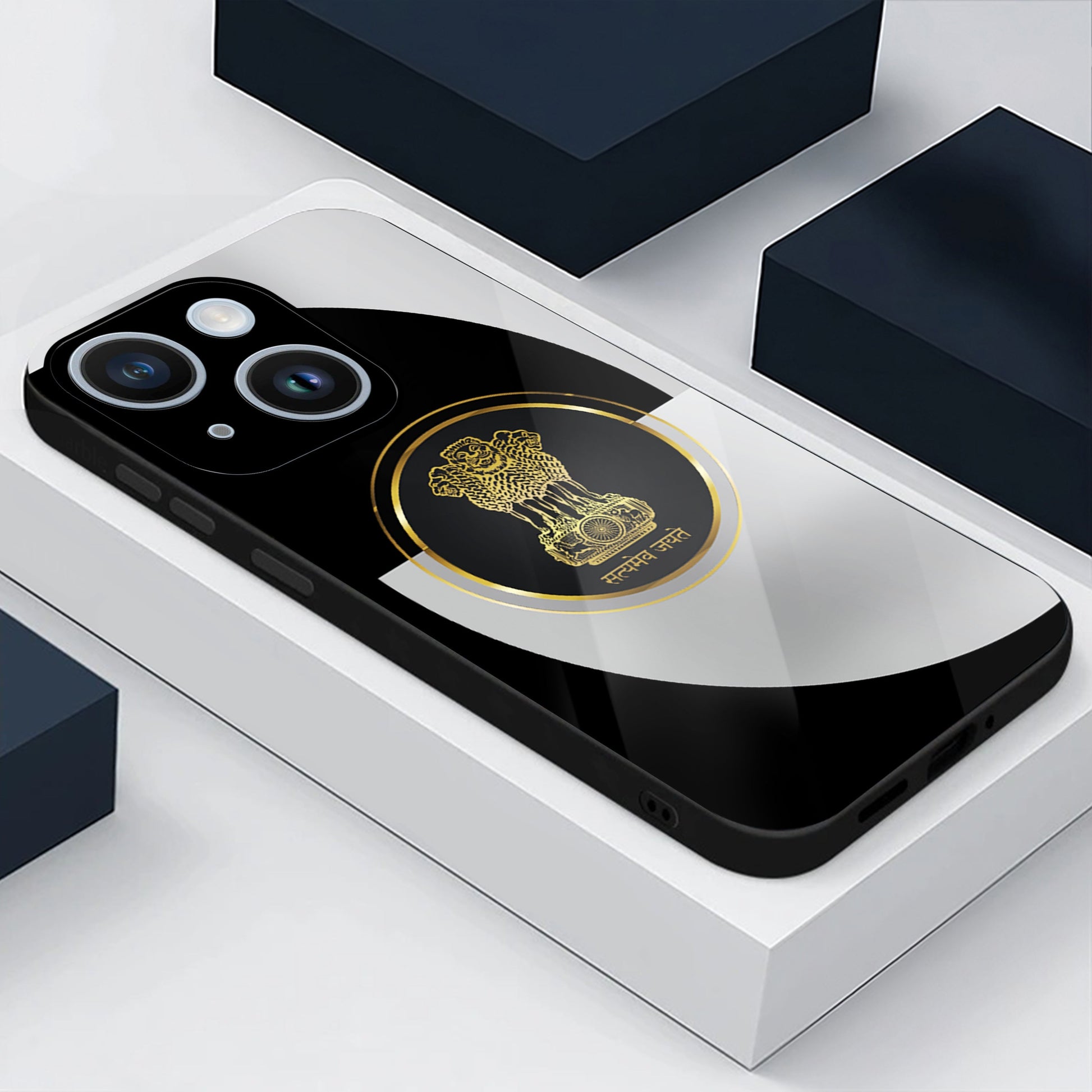 iPhone 15 Premium Acrylic Shockproof Glass Back Case (Satyamev Noir)